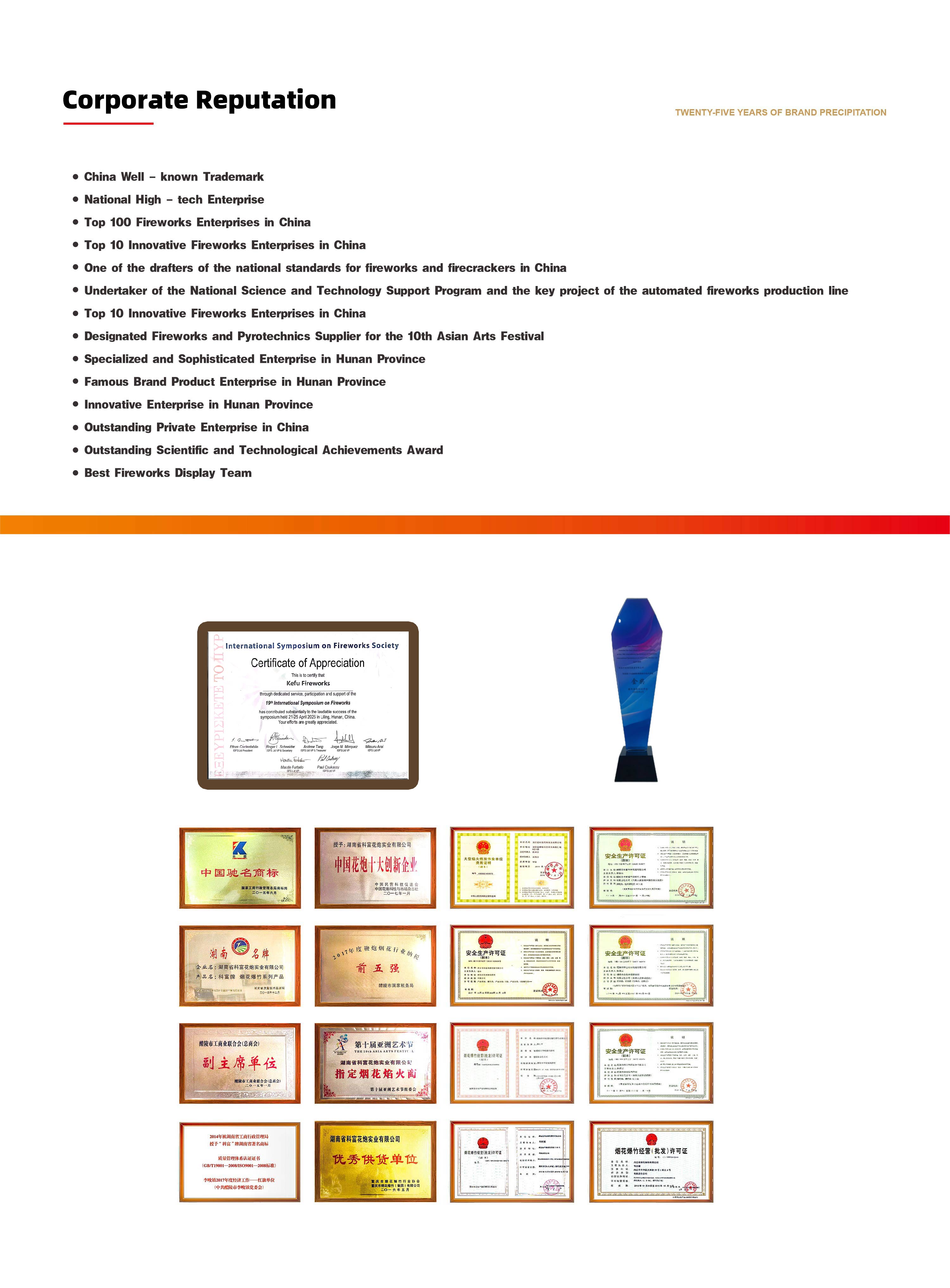 Hunan Kefu Fireworks Industry Co., Ltd was established in 1999. It is located in Litian Town, Liling City, the hometown of Li Tian, the founder of fireworks. Kefu Industry is a leading manufacturer in the industry. With integrating scientific research, production, sales, large-scale fireworks display and investment of fireworks products.